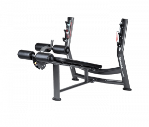 Our Olympic Decline Bench has three Olympic bar racking positions and has an adjustable kneepad to accommodate users of all sizes.